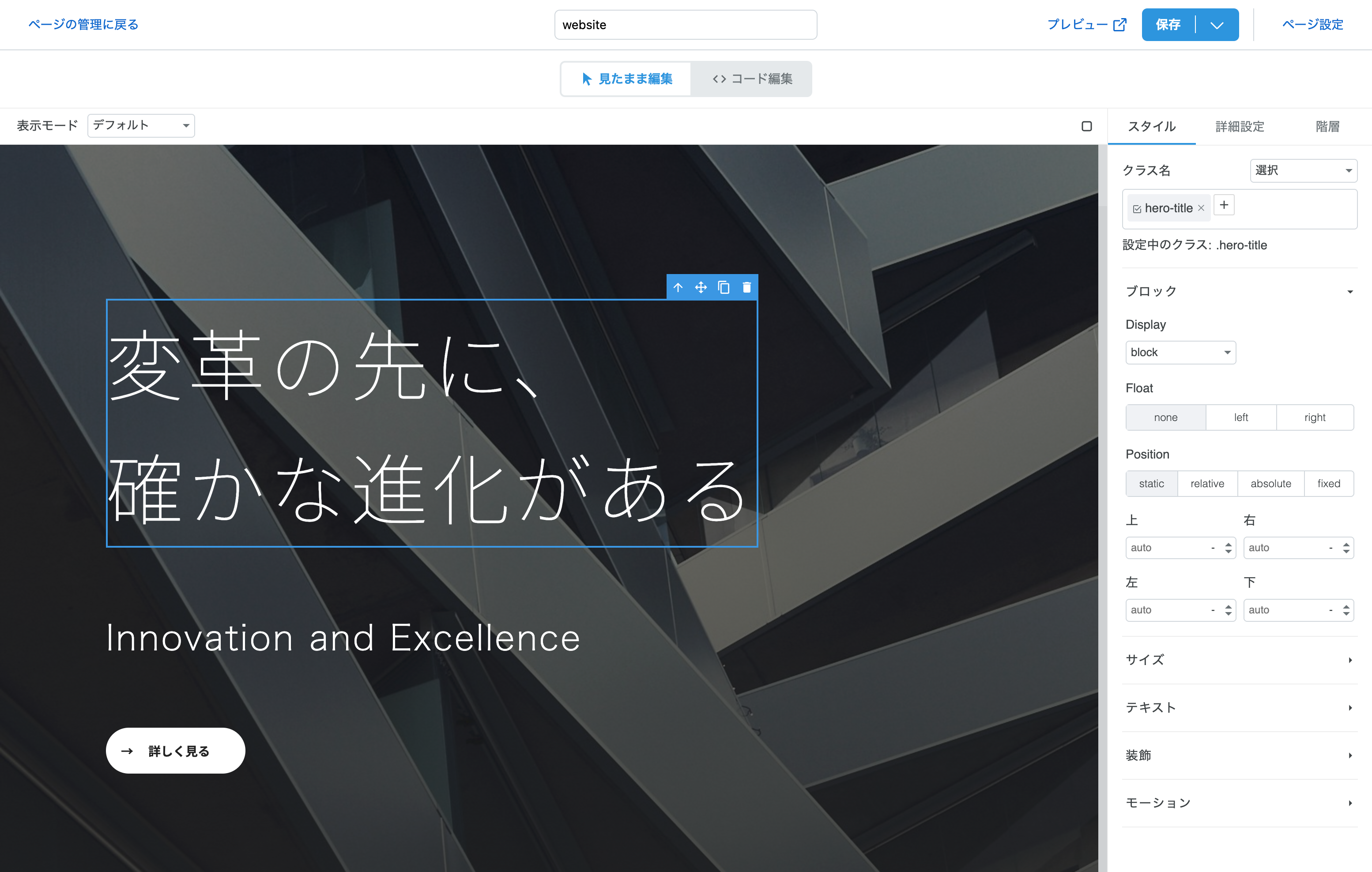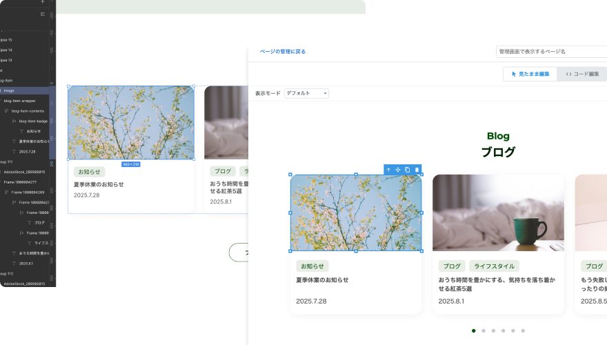 コードを使わずサイトを見たまま編集できる「見たまま編集モード」と、自由にコードを記述できる「コード編集モード」を使って、柔軟に公開前の調整が可能です。